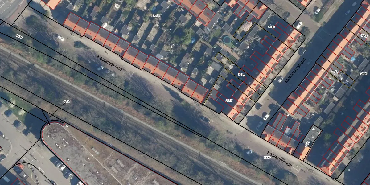 Kastanjekade 13 is gelegen op kadastraal perceel LDN01M9546. Deze kadastrale aanduiding is uniek en wordt gebruikt door het Kadaster om eigendomsrechten en andere zakelijke rechten vast te leggen. Het perceel maakt onderdeel uit van de kadastrale gemeente Leiden.