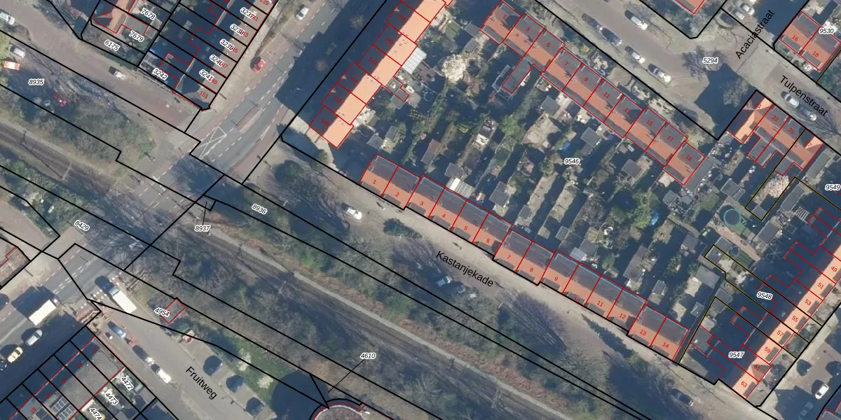 Kastanjekade 3 is gelegen op kadastraal perceel LDN01M9546. Deze kadastrale aanduiding is uniek en wordt gebruikt door het Kadaster om eigendomsrechten en andere zakelijke rechten vast te leggen. Het perceel maakt onderdeel uit van de kadastrale gemeente Leiden.