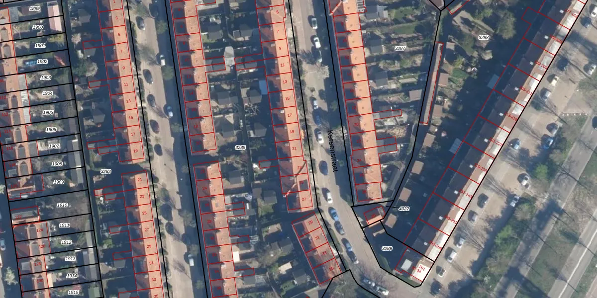 Kersenstraat 21 is gelegen op kadastraal perceel LDN01O3285. Deze kadastrale aanduiding is uniek en wordt gebruikt door het Kadaster om eigendomsrechten en andere zakelijke rechten vast te leggen. Het perceel maakt onderdeel uit van de kadastrale gemeente Leiden.