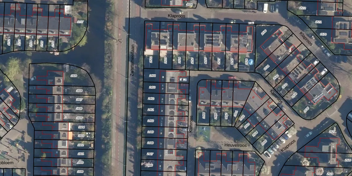 Klimroos 30 is gelegen op kadastraal perceel LDN01S2453. Deze kadastrale aanduiding is uniek en wordt gebruikt door het Kadaster om eigendomsrechten en andere zakelijke rechten vast te leggen. Het perceel maakt onderdeel uit van de kadastrale gemeente Leiden.
