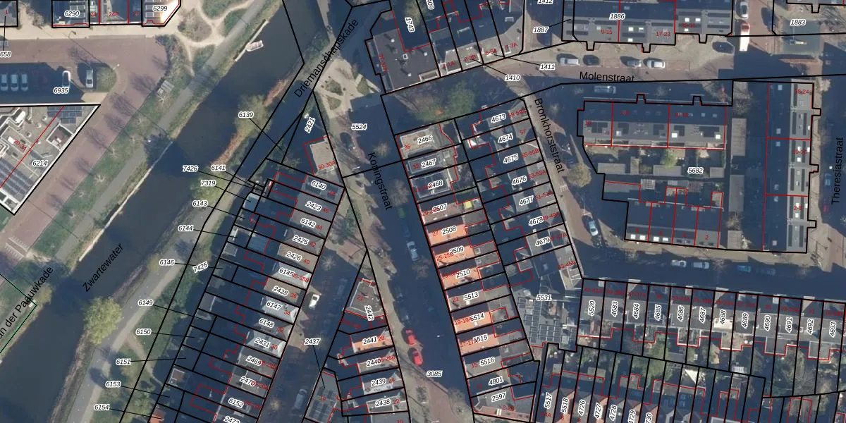 Het adres is gelegen op perceel 2507 in de sectie K en de kadastrale gemeente Leiden. De kadastrale aanduiding is aldus LDN01-K-2507. De gemiddelde perceelgrootte in Leiden is 704,18 m². Dit perceel is kleiner: de perceeloppervlakte bedraagt 83 m². Het grootste perceel in de kadastrale gemeente is 51,8 ha. Het kleinste perceel heeft een oppervlakte van 0 m². Er zijn 2 adressen aanwezig op het perceel. De laatste wijziging in het de Basisregistratie Kadaster (BRK) was op 27-08-2003.
