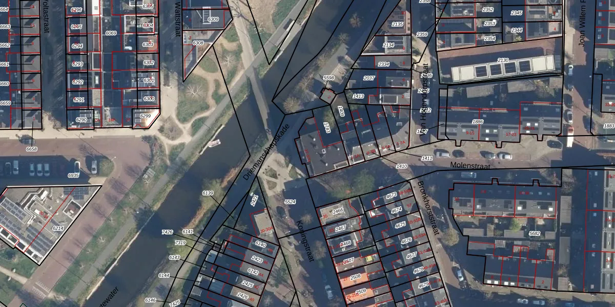 Het adres is gelegen op perceel 1743 in de sectie N en de kadastrale gemeente Leiden. De kadastrale aanduiding is aldus LDN01-N-1743. De gemiddelde perceelgrootte in Leiden is 703,94 m². Dit perceel is kleiner: de perceeloppervlakte bedraagt 265 m². Het grootste perceel in de kadastrale gemeente is 51,8 ha. Het kleinste perceel heeft een oppervlakte van 0 m². Op het perceel zijn 10 adressen aanwezig. De huidige grenzen van het perceel zijn digitaal in de Basisregistratie Kadaster (BRK) geregistreerd op 24-08-2006.