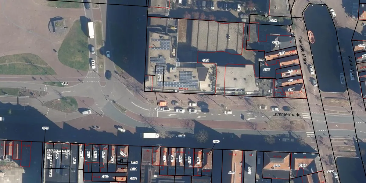 Het perceel waarop Lammermarkt 100 staat heeft een oppervlakte van 2377 m². Dit is een zeer groot perceel. De perceeloppervlakte wordt geregistreerd door het Kadaster. Gedetailleerde informatie over de maten van dit perceel kunt u vinden in het rapport Kadastrale kaart met maatvoering van Lammermarkt 100.
