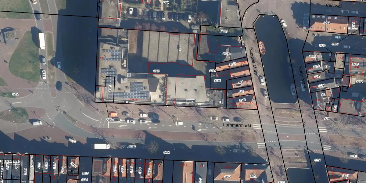 Het perceel waarop Lammermarkt 188 staat heeft een oppervlakte van 2377 m². Dit is een zeer groot perceel. De perceeloppervlakte wordt geregistreerd door het Kadaster. Gedetailleerde informatie over de maten van dit perceel kunt u vinden in het rapport Kadastrale kaart met maatvoering van Lammermarkt 188.
