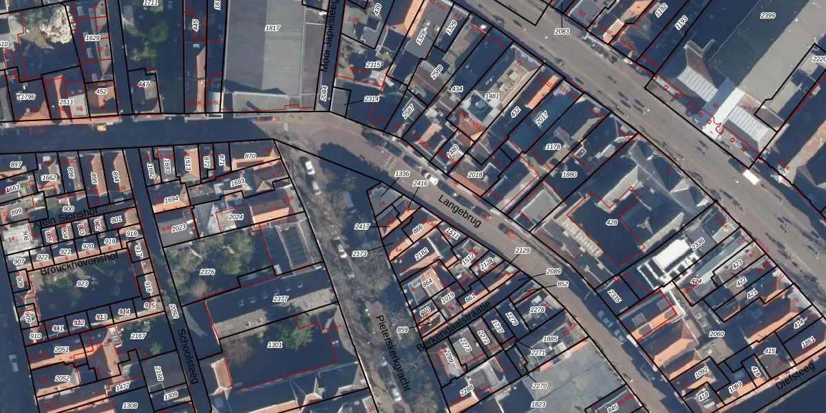 Langebrug 21 is gelegen op kadastraal perceel LDN01G2416. Deze kadastrale aanduiding is uniek en wordt gebruikt door het Kadaster om eigendomsrechten en andere zakelijke rechten vast te leggen. Het perceel maakt onderdeel uit van de kadastrale gemeente Leiden.