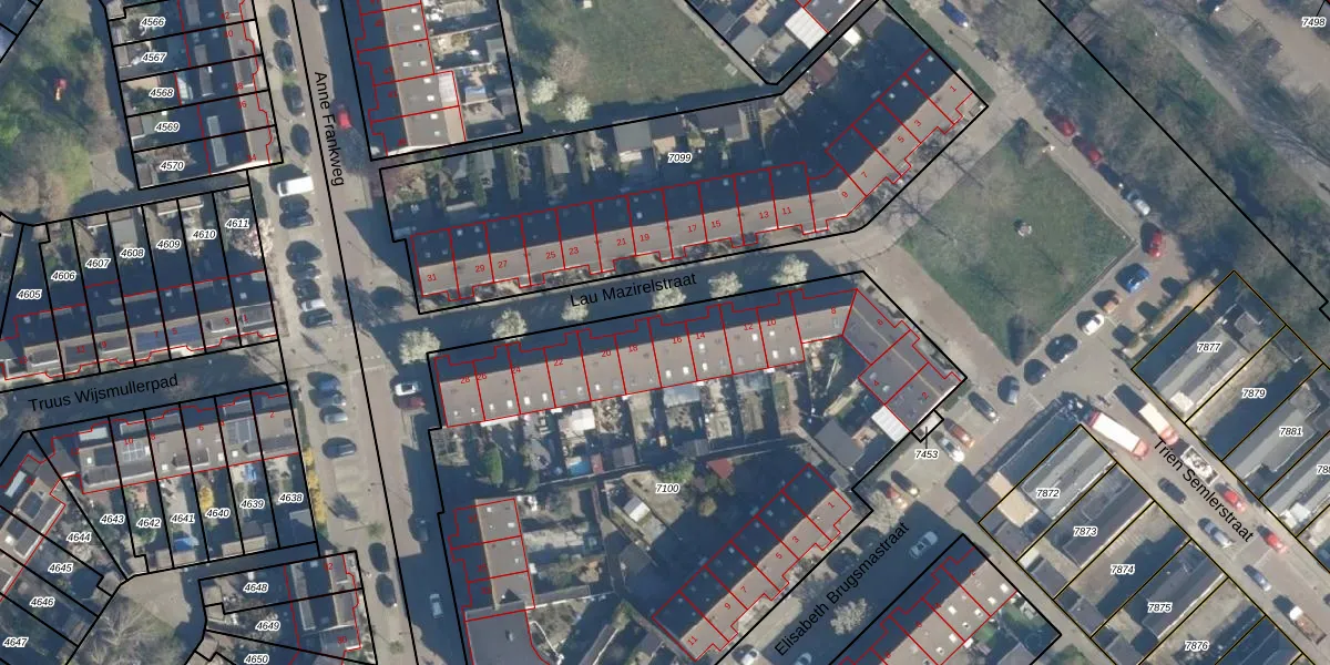 Lau Mazirelstraat 16 is gelegen op kadastraal perceel LDN01W7100. Deze kadastrale aanduiding is uniek en wordt gebruikt door het Kadaster om eigendomsrechten en andere zakelijke rechten vast te leggen. Het perceel maakt onderdeel uit van de kadastrale gemeente Leiden.