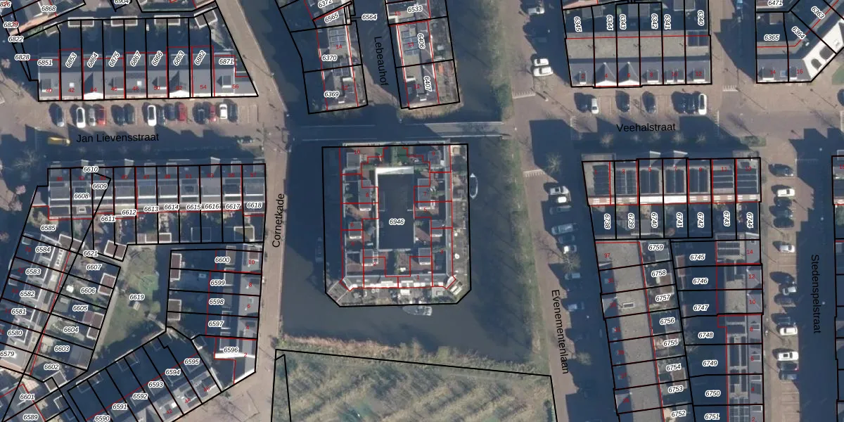 Het adres ligt op het perceel LDN01-K-6946, dat zich in de kadastrale gemeente Leiden bevindt. De oppervlakte van het perceel is 1289 m². Dat is groter dan gemiddeld in Leiden, waar de gemiddelde perceeloppervlakte op 703,94 m² ligt. De grootste perceeloppervlakte in de kadastrale gemeente is 51,8 ha. De kleinste oppervlakte bedraagt 0 m². Er zijn 10 adressen aanwezig op het perceel. De huidige grenzen van het perceel zijn digitaal in de Basisregistratie Kadaster (BRK) geregistreerd op 24-05-2018.
