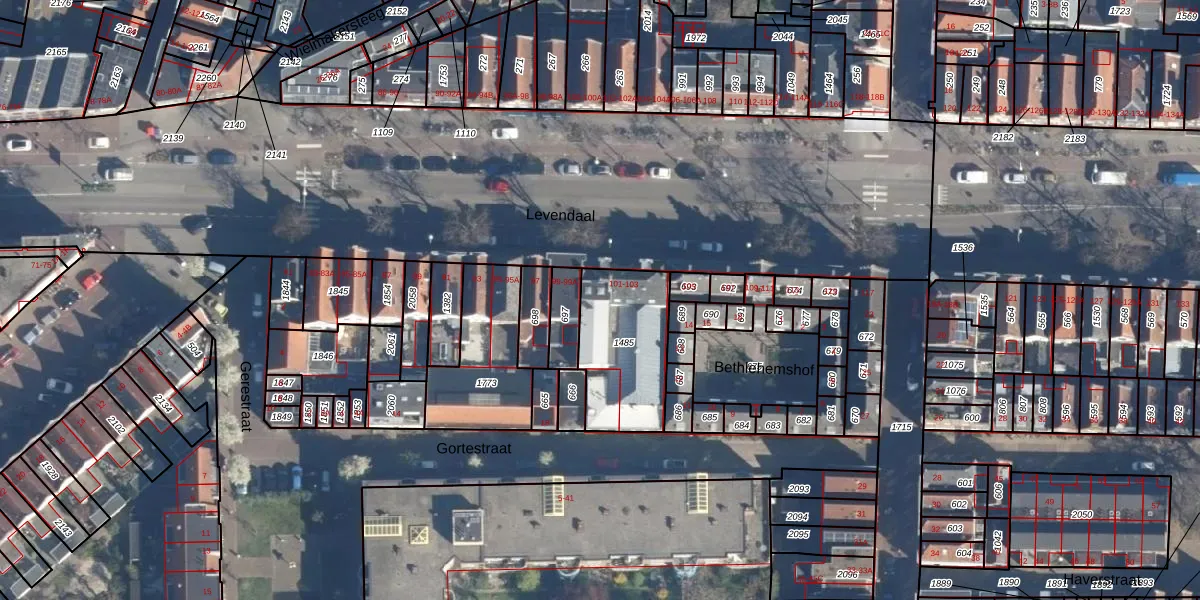 Het perceel waarop Levendaal 101-E staat heeft een oppervlakte van 375 m². Dit is een groot perceel. De perceeloppervlakte wordt geregistreerd door het Kadaster. Gedetailleerde informatie over de maten van dit perceel kunt u vinden in het rapport Kadastrale kaart met maatvoering van Levendaal 101-E.