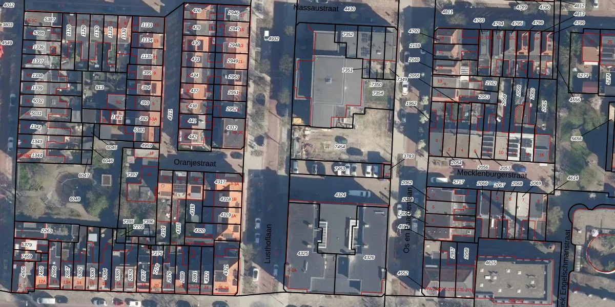 Het perceel waarop Lusthoflaan 4-L staat heeft een oppervlakte van 448 m². Dit is een groot perceel. De perceeloppervlakte wordt geregistreerd door het Kadaster. Gedetailleerde informatie over de maten van dit perceel kunt u vinden in het rapport Kadastrale kaart met maatvoering van Lusthoflaan 4-L.