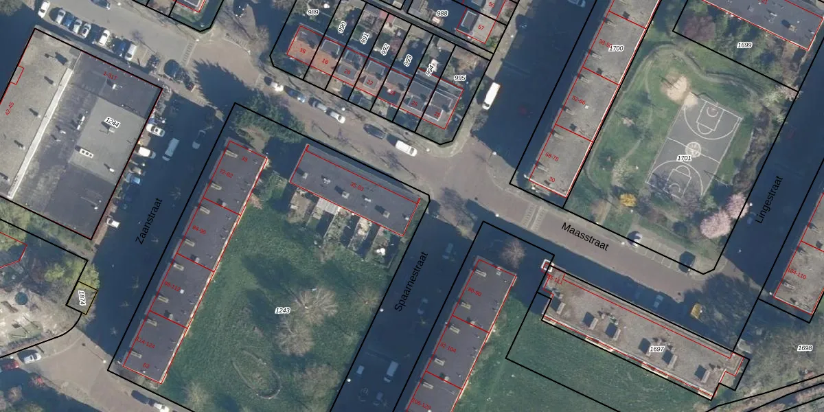 Maasstraat 43 is gelegen op kadastraal perceel LDN01Q1243. Deze kadastrale aanduiding is uniek en wordt gebruikt door het Kadaster om eigendomsrechten en andere zakelijke rechten vast te leggen. Het perceel maakt onderdeel uit van de kadastrale gemeente Leiden.