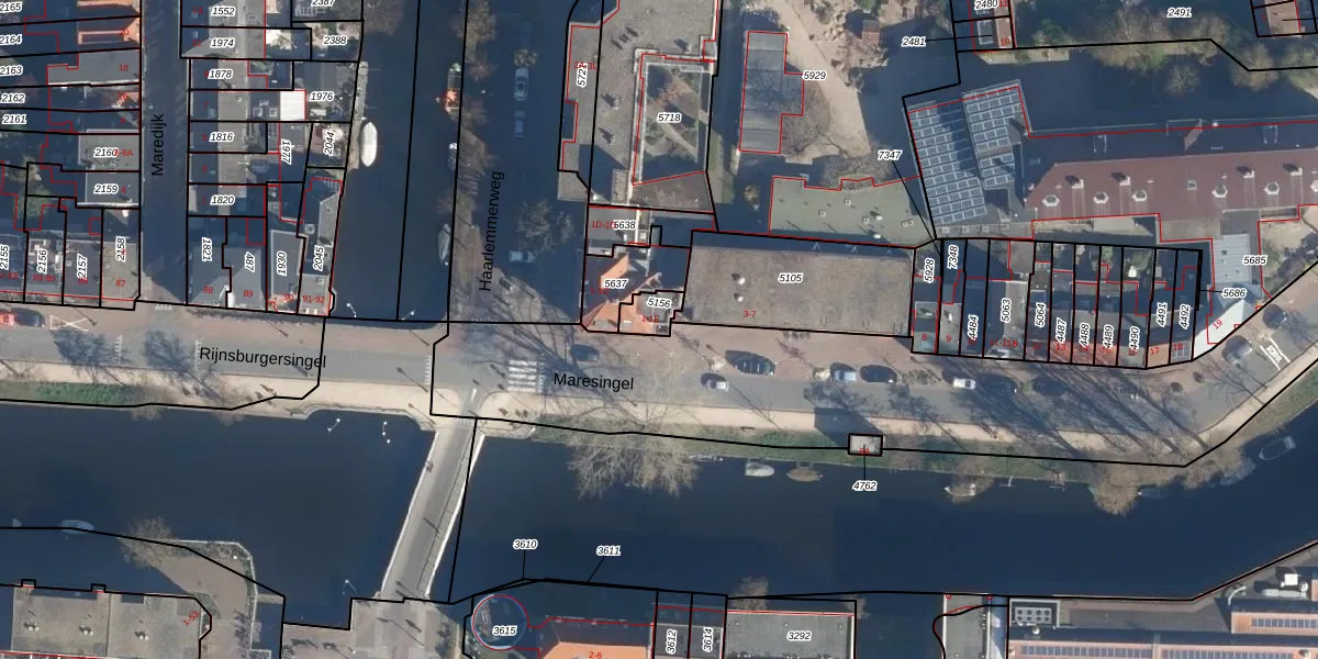 Maresingel 1 is gelegen op kadastraal perceel LDN01K5156. Deze kadastrale aanduiding is uniek en wordt gebruikt door het Kadaster om eigendomsrechten en andere zakelijke rechten vast te leggen. Het perceel maakt onderdeel uit van de kadastrale gemeente Leiden.