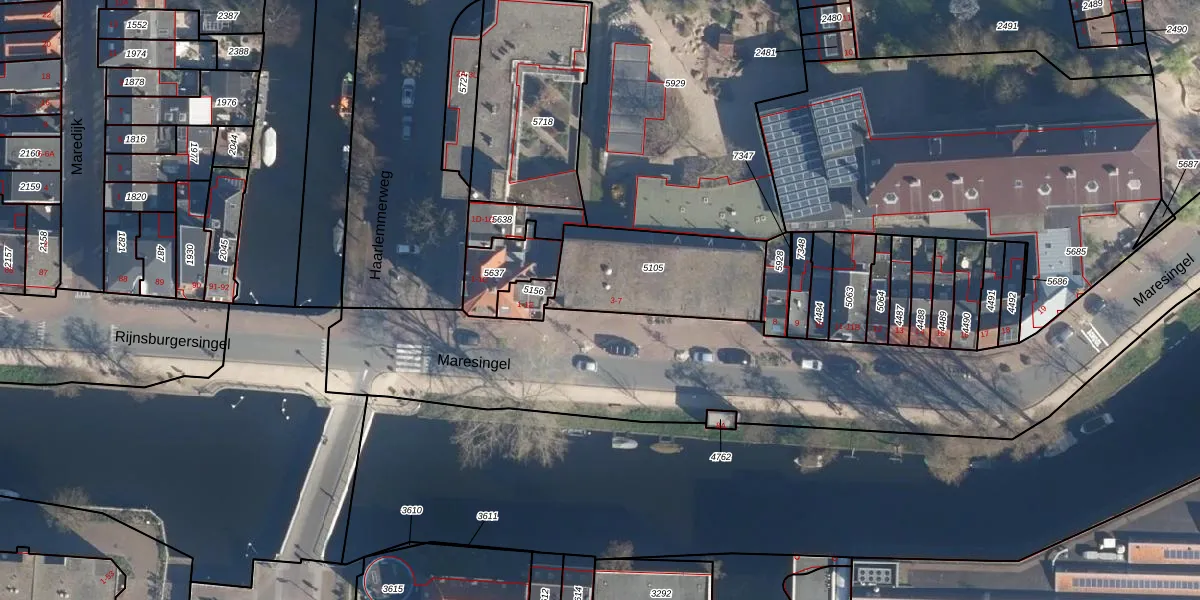 Maresingel 4 is gelegen op kadastraal perceel LDN01K5105. Deze kadastrale aanduiding is uniek en wordt gebruikt door het Kadaster om eigendomsrechten en andere zakelijke rechten vast te leggen. Het perceel maakt onderdeel uit van de kadastrale gemeente Leiden.