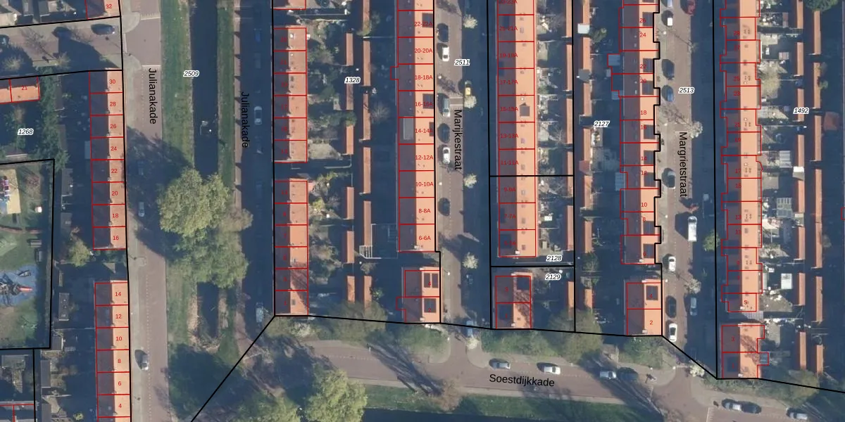 Het perceel waarop Marijkestraat 8-A staat heeft een oppervlakte van 4918 m². Dit is een zeer groot perceel. De perceeloppervlakte wordt geregistreerd door het Kadaster. Gedetailleerde informatie over de maten van dit perceel kunt u vinden in het rapport Kadastrale kaart met maatvoering van Marijkestraat 8-A.