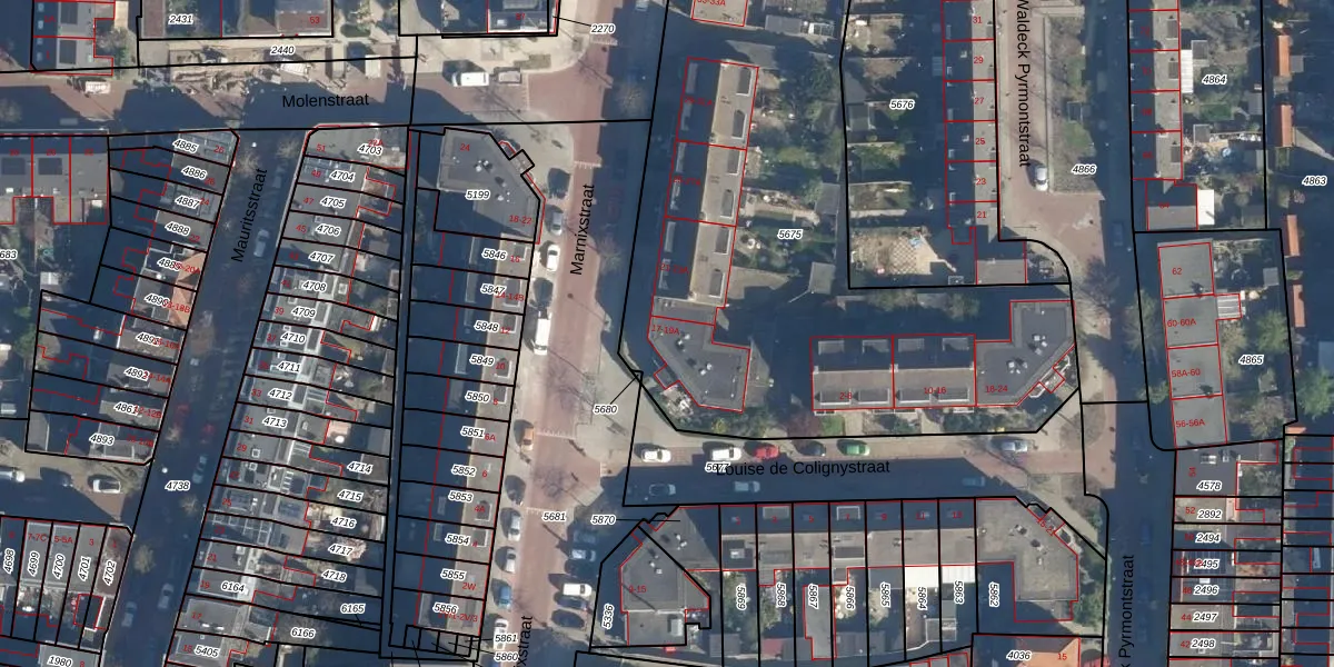 Het perceel waarop Marnixstraat 19-A staat heeft een oppervlakte van 3142 m². Dit is een zeer groot perceel. De perceeloppervlakte wordt geregistreerd door het Kadaster. Gedetailleerde informatie over de maten van dit perceel kunt u vinden in het rapport Kadastrale kaart met maatvoering van Marnixstraat 19-A.
