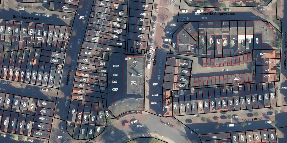 Het adres is gelegen op perceel 5551 in de sectie K en de kadastrale gemeente Leiden. De kadastrale aanduiding is aldus LDN01-K-5551. Het perceel is met 1055 m² relatief groot. Het gemiddelde ligt in de kadastrale gemeente Leiden op 703,99 m². Het kleinste perceel in de kadastrale gemeente is 0 m² groot. De grootste perceeloppervlakte is 51,8 ha. Op het perceel liggen in totaal 31 adressen. De huidige grenzen van het perceel zijn digitaal in de Basisregistratie Kadaster (BRK) geregistreerd op 16-04-2010.