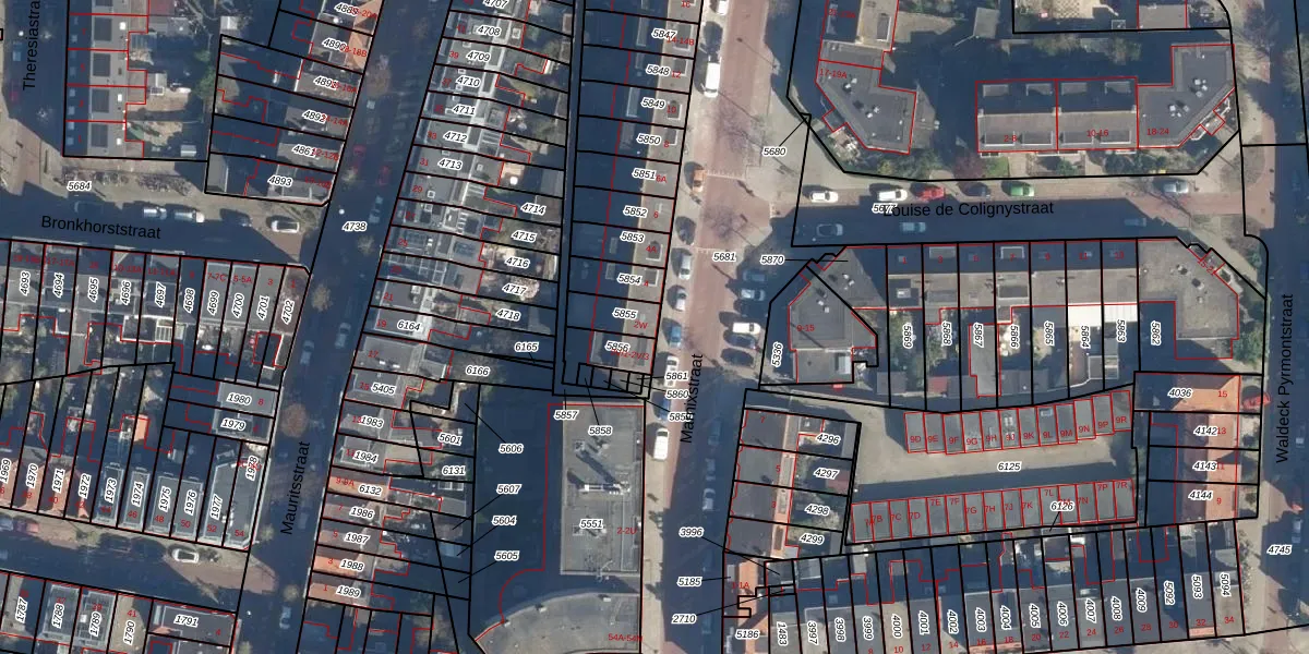 Het adres is gelegen op perceel 5855 in de sectie K en de kadastrale gemeente Leiden. De kadastrale aanduiding is aldus LDN01-K-5855. De gemiddelde perceelgrootte in Leiden is 703,99 m². Dit perceel is kleiner: de perceeloppervlakte bedraagt 78 m². Het kleinste perceel in de kadastrale gemeente is 0 m² groot. De grootste perceeloppervlakte is 51,8 ha. Op het perceel bevinden zich geen andere adressen. De huidige grenzen van het perceel zijn digitaal in de Basisregistratie Kadaster (BRK) geregistreerd op 27-08-2003.