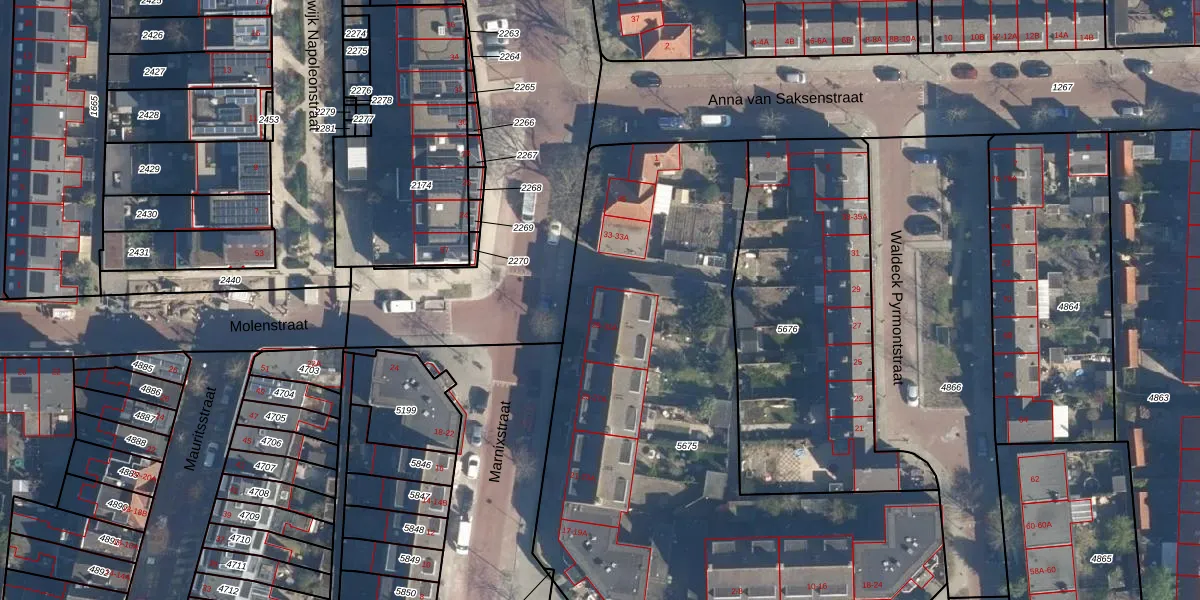 Het perceel waarop Marnixstraat 31 staat heeft een oppervlakte van 3142 m². Dit is een zeer groot perceel. De perceeloppervlakte wordt geregistreerd door het Kadaster. Gedetailleerde informatie over de maten van dit perceel kunt u vinden in het rapport Kadastrale kaart met maatvoering van Marnixstraat 31.