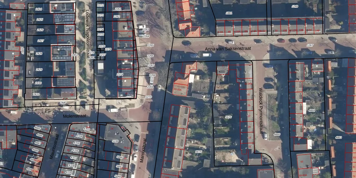 Het perceel waarop Marnixstraat 33-A staat heeft een oppervlakte van 3142 m². Dit is een zeer groot perceel. De perceeloppervlakte wordt geregistreerd door het Kadaster. Gedetailleerde informatie over de maten van dit perceel kunt u vinden in het rapport Kadastrale kaart met maatvoering van Marnixstraat 33-A.