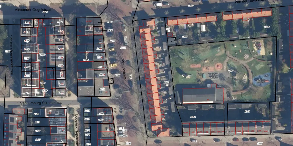 Het perceel waarop Marnixstraat 51 staat heeft een oppervlakte van 1823 m². Dit is een zeer groot perceel. De perceeloppervlakte wordt geregistreerd door het Kadaster. Gedetailleerde informatie over de maten van dit perceel kunt u vinden in het rapport Kadastrale kaart met maatvoering van Marnixstraat 51.