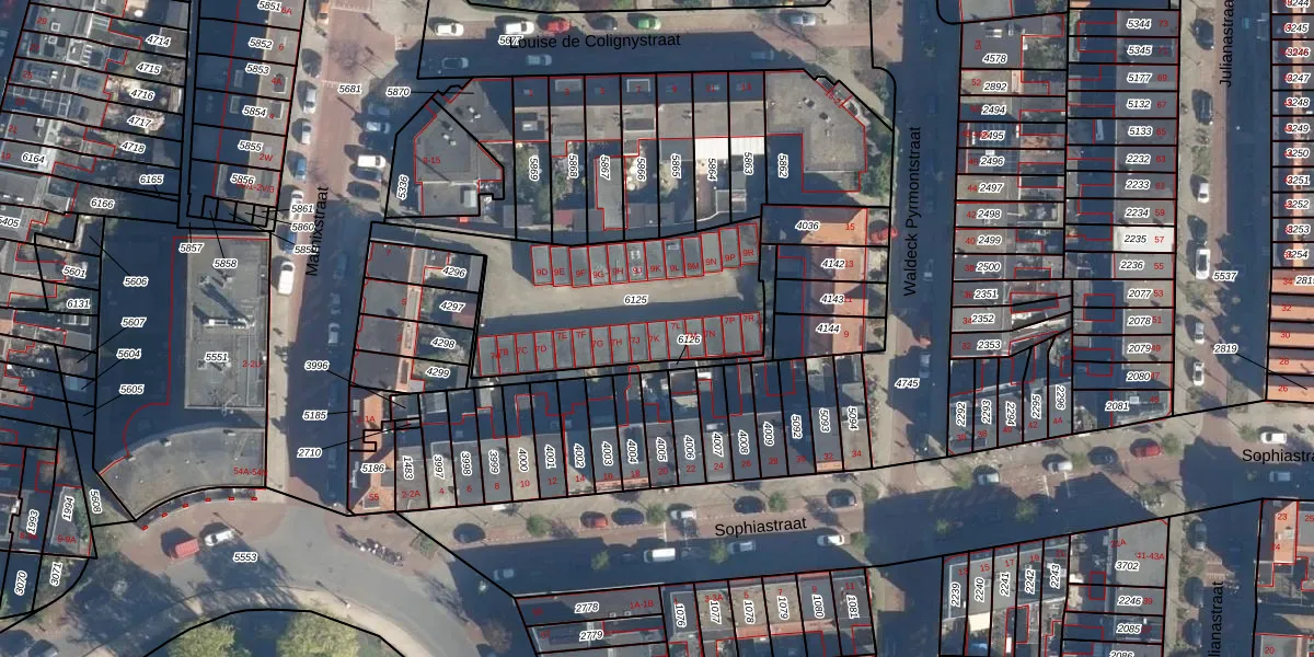 Het adres ligt op het perceel LDN01-K-6125, dat zich in de kadastrale gemeente Leiden bevindt. De oppervlakte van het perceel is 880 m². Dat is groter dan gemiddeld in Leiden, waar de gemiddelde perceeloppervlakte op 703,94 m² ligt. De grootste perceeloppervlakte in de kadastrale gemeente is 51,8 ha. De kleinste oppervlakte bedraagt 0 m². Er zijn 27 adressen aanwezig op het perceel. De huidige grenzen van het perceel zijn digitaal in de Basisregistratie Kadaster (BRK) geregistreerd op 23-11-2009.