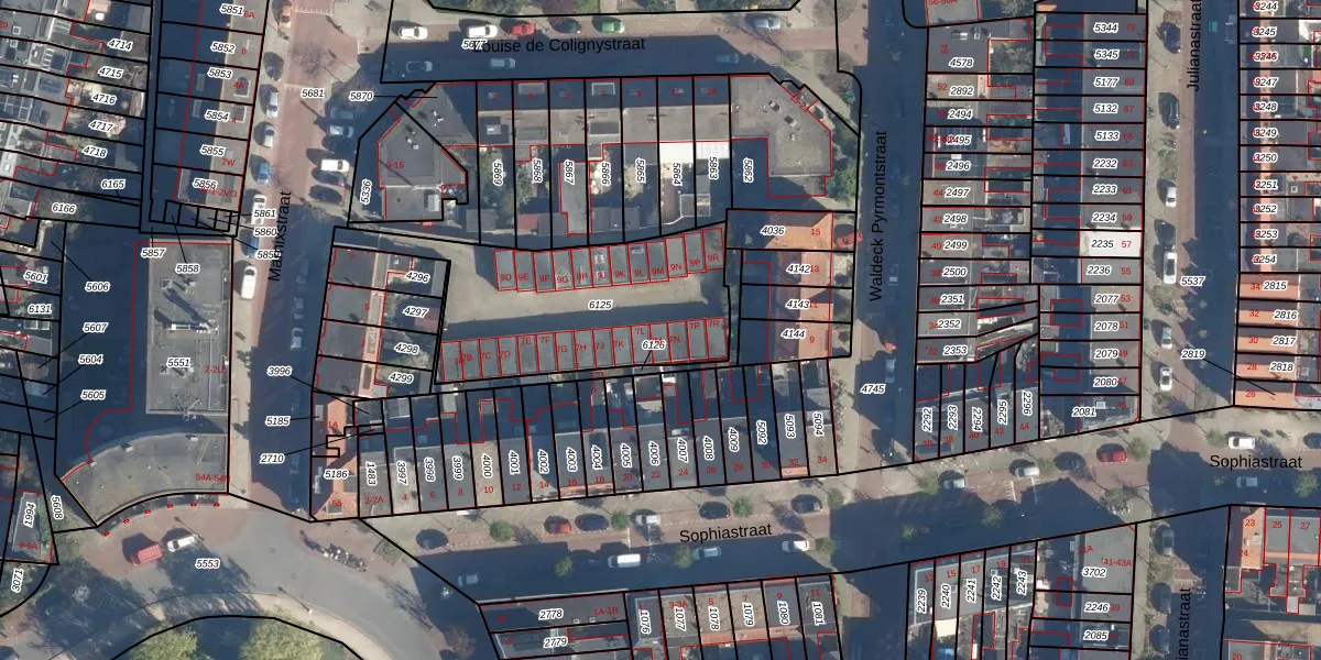 Het adres ligt op het perceel LDN01-K-6125, dat zich in de kadastrale gemeente Leiden bevindt. De oppervlakte van het perceel is 880 m². Dat is groter dan gemiddeld in Leiden, waar de gemiddelde perceeloppervlakte op 703,99 m² ligt. De grootste perceeloppervlakte in de kadastrale gemeente is 51,8 ha. De kleinste oppervlakte bedraagt 0 m². Er zijn 27 adressen aanwezig op het perceel. In de Basisregistratie Kadaster (BRK) werden de grenzen van het perceel geregistreerd op 23-11-2009.