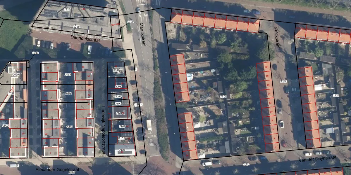 Het perceel waarop Marnixstraat 77 staat heeft een oppervlakte van 4545 m². Dit is een zeer groot perceel. De perceeloppervlakte wordt geregistreerd door het Kadaster. Gedetailleerde informatie over de maten van dit perceel kunt u vinden in het rapport Kadastrale kaart met maatvoering van Marnixstraat 77.