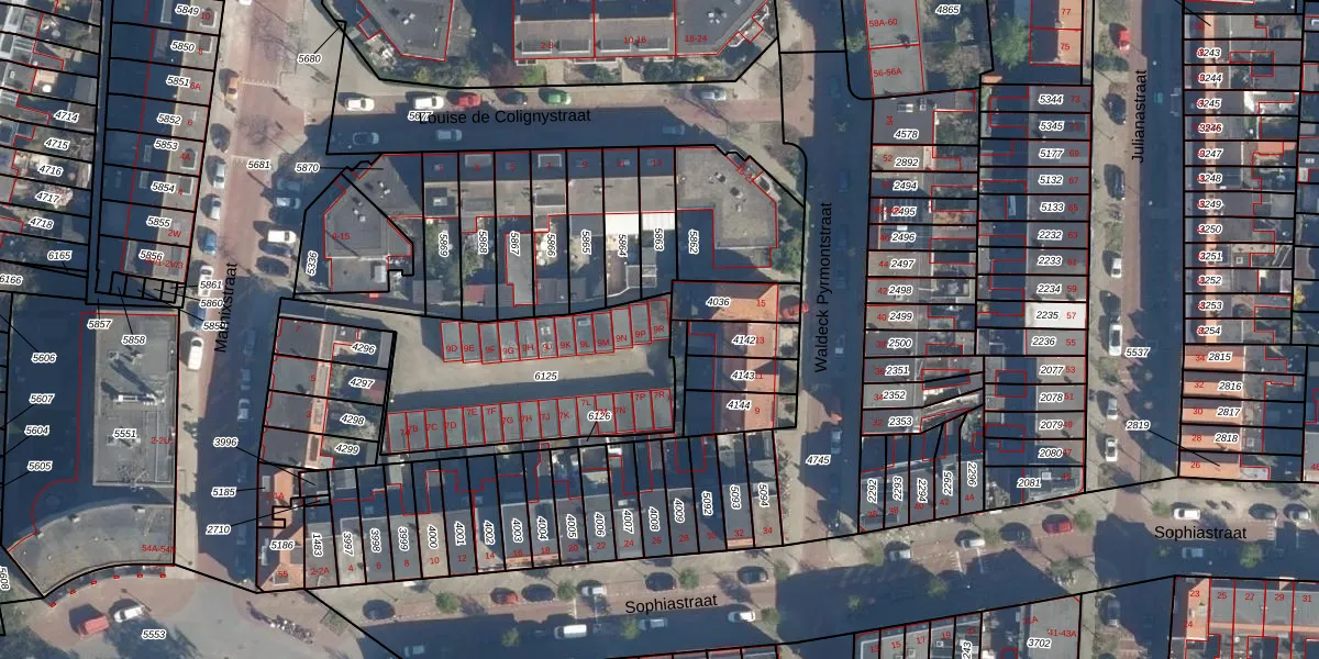 Het adres ligt op het perceel LDN01-K-6125, dat zich in de kadastrale gemeente Leiden bevindt. De oppervlakte van het perceel is 880 m². Dat is groter dan gemiddeld in Leiden, waar de gemiddelde perceeloppervlakte op 704,01 m² ligt. De grootste perceeloppervlakte in de kadastrale gemeente is 51,8 ha. De kleinste oppervlakte bedraagt 0 m². Op het perceel liggen in totaal 27 adressen. De huidige grenzen van het perceel zijn digitaal in de Basisregistratie Kadaster (BRK) geregistreerd op 23-11-2009.