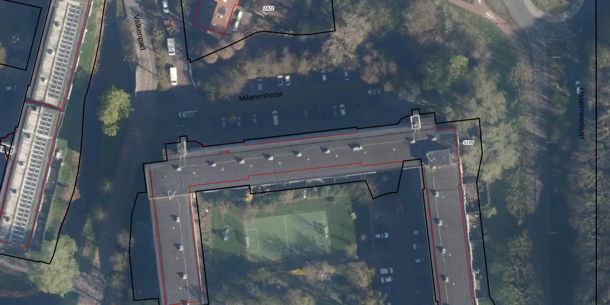 Het perceel waarop Milanenhorst 101 staat heeft een oppervlakte van 5518 m². Dit is een zeer groot perceel. De perceeloppervlakte wordt geregistreerd door het Kadaster. Gedetailleerde informatie over de maten van dit perceel kunt u vinden in het rapport Kadastrale kaart met maatvoering van Milanenhorst 101.