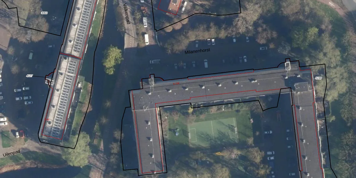 Het perceel waarop Milanenhorst 104 staat heeft een oppervlakte van 5518 m². Dit is een zeer groot perceel. De perceeloppervlakte wordt geregistreerd door het Kadaster. Gedetailleerde informatie over de maten van dit perceel kunt u vinden in het rapport Kadastrale kaart met maatvoering van Milanenhorst 104.