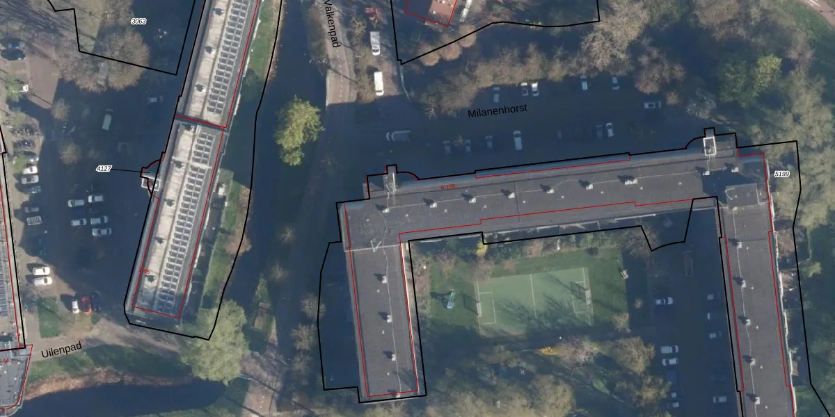 Het perceel waarop Milanenhorst 135 staat heeft een oppervlakte van 5518 m². Dit is een zeer groot perceel. De perceeloppervlakte wordt geregistreerd door het Kadaster. Gedetailleerde informatie over de maten van dit perceel kunt u vinden in het rapport Kadastrale kaart met maatvoering van Milanenhorst 135.
