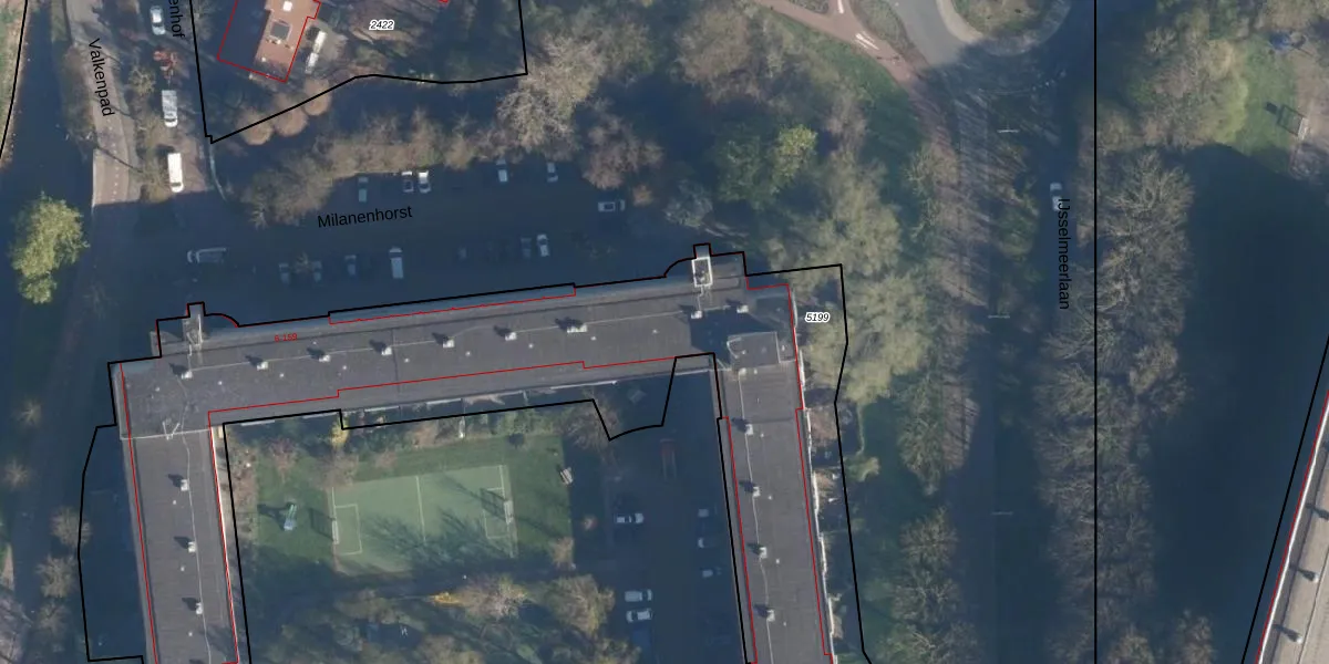 Het perceel waarop Milanenhorst 148 staat heeft een oppervlakte van 5518 m². Dit is een zeer groot perceel. De perceeloppervlakte wordt geregistreerd door het Kadaster. Gedetailleerde informatie over de maten van dit perceel kunt u vinden in het rapport Kadastrale kaart met maatvoering van Milanenhorst 148.