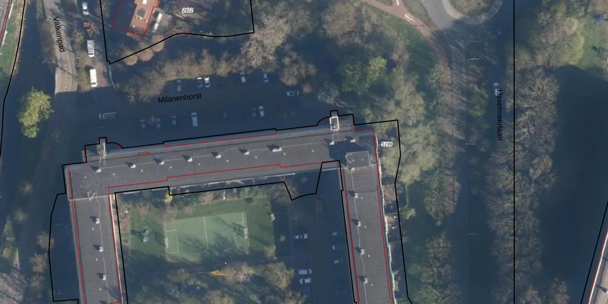 Het perceel waarop Milanenhorst 149 staat heeft een oppervlakte van 5518 m². Dit is een zeer groot perceel. De perceeloppervlakte wordt geregistreerd door het Kadaster. Gedetailleerde informatie over de maten van dit perceel kunt u vinden in het rapport Kadastrale kaart met maatvoering van Milanenhorst 149.