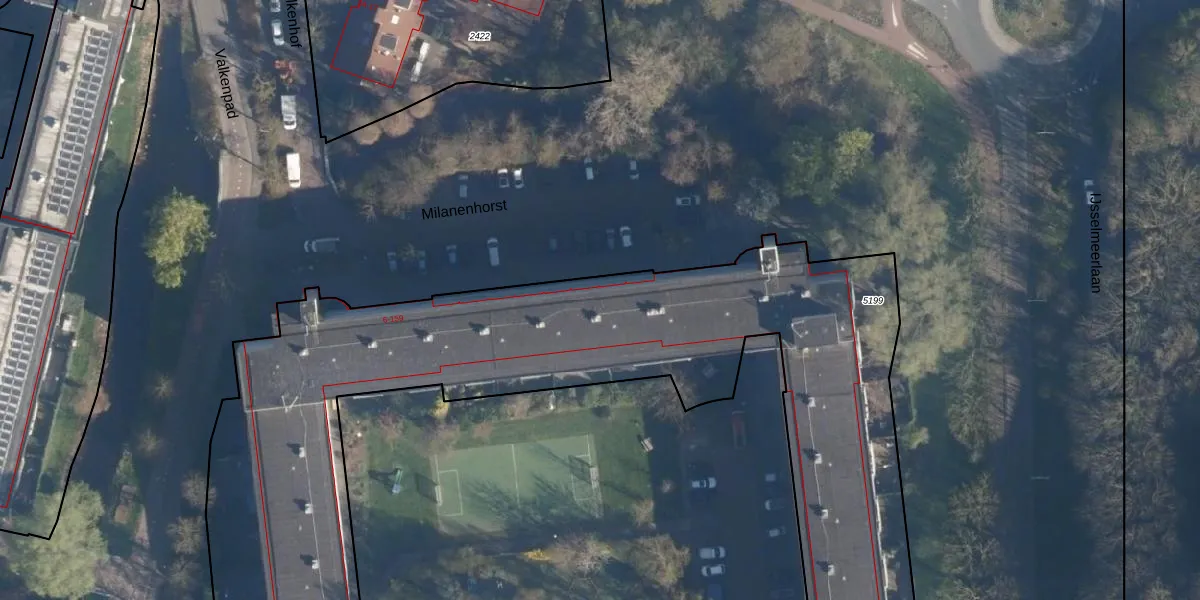 Het perceel waarop Milanenhorst 40 staat heeft een oppervlakte van 5518 m². Dit is een zeer groot perceel. De perceeloppervlakte wordt geregistreerd door het Kadaster. Gedetailleerde informatie over de maten van dit perceel kunt u vinden in het rapport Kadastrale kaart met maatvoering van Milanenhorst 40.