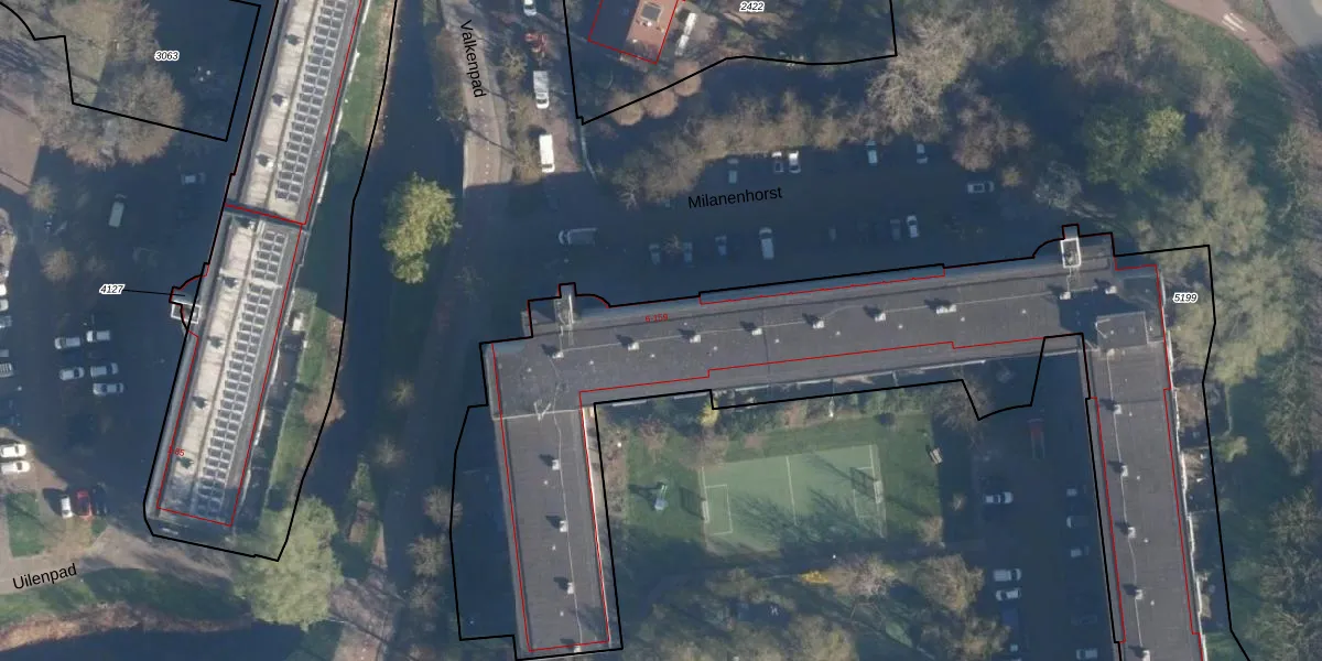 Het perceel waarop Milanenhorst 74 staat heeft een oppervlakte van 5518 m². Dit is een zeer groot perceel. De perceeloppervlakte wordt geregistreerd door het Kadaster. Gedetailleerde informatie over de maten van dit perceel kunt u vinden in het rapport Kadastrale kaart met maatvoering van Milanenhorst 74.