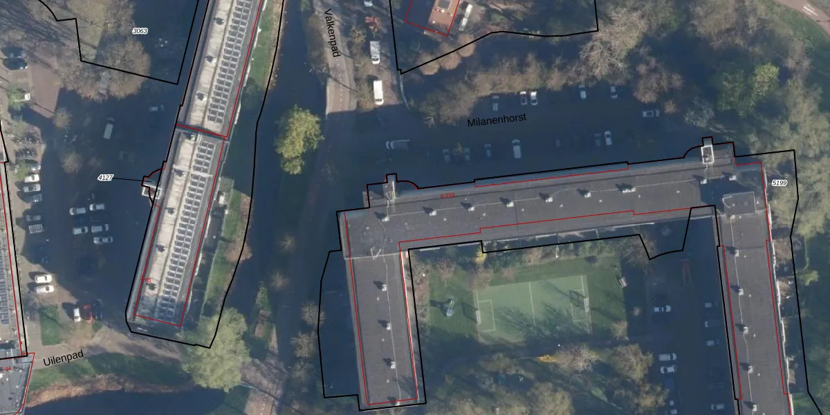 Het perceel waarop Milanenhorst 75 staat heeft een oppervlakte van 5518 m². Dit is een zeer groot perceel. De perceeloppervlakte wordt geregistreerd door het Kadaster. Gedetailleerde informatie over de maten van dit perceel kunt u vinden in het rapport Kadastrale kaart met maatvoering van Milanenhorst 75.