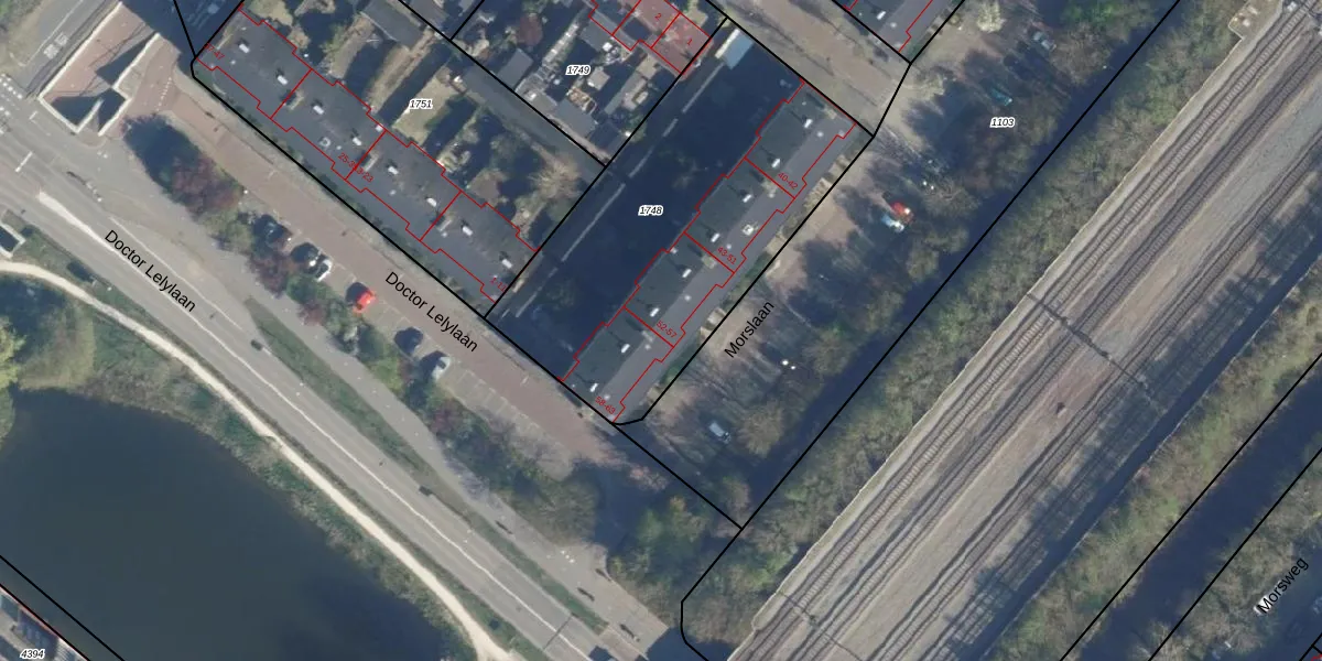 Het perceel waarop Morslaan 56 staat heeft een oppervlakte van 1676 m². Dit is een zeer groot perceel. De perceeloppervlakte wordt geregistreerd door het Kadaster. Gedetailleerde informatie over de maten van dit perceel kunt u vinden in het rapport Kadastrale kaart met maatvoering van Morslaan 56.