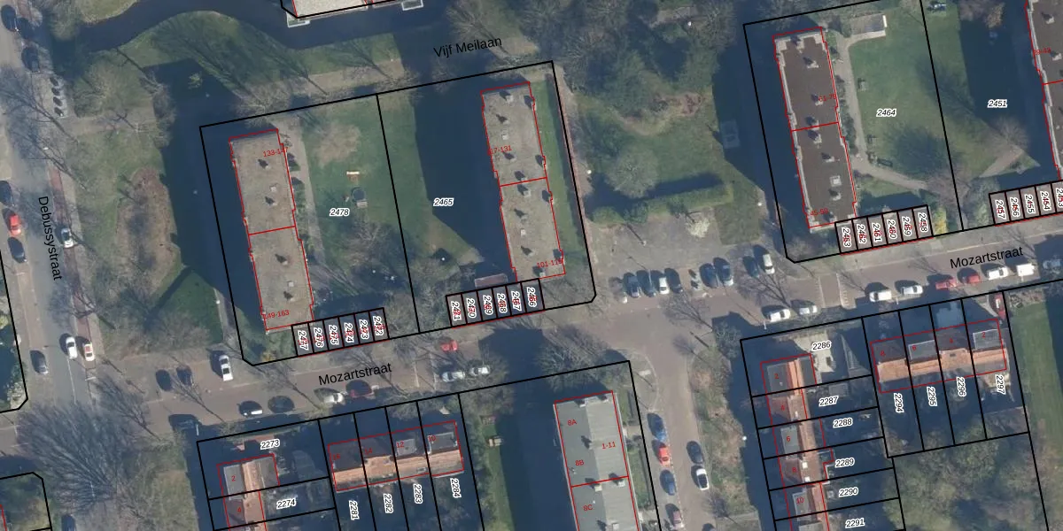 Mozartstraat 103 is gelegen op kadastraal perceel LDN01O2465. Deze kadastrale aanduiding is uniek en wordt gebruikt door het Kadaster om eigendomsrechten en andere zakelijke rechten vast te leggen. Het perceel maakt onderdeel uit van de kadastrale gemeente Leiden.
