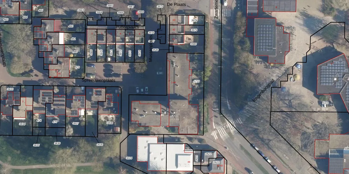 Het perceel waarop Mussenplaats 15 staat heeft een oppervlakte van 1495 m². Dit is een zeer groot perceel. De perceeloppervlakte wordt geregistreerd door het Kadaster. Gedetailleerde informatie over de maten van dit perceel kunt u vinden in het rapport Kadastrale kaart met maatvoering van Mussenplaats 15.