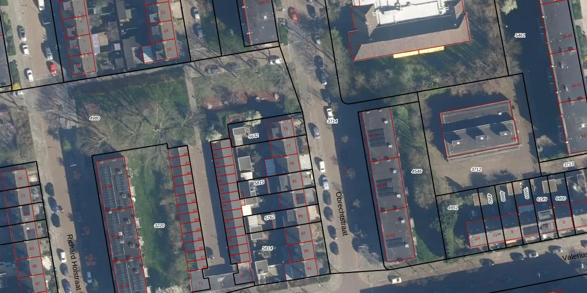 Het perceel waarop Obrechtstraat 77 staat heeft een oppervlakte van 1273 m². Dit is een zeer groot perceel. De perceeloppervlakte wordt geregistreerd door het Kadaster. Gedetailleerde informatie over de maten van dit perceel kunt u vinden in het rapport Kadastrale kaart met maatvoering van Obrechtstraat 77.