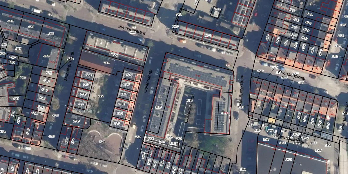 Het perceel waarop Oosterpassage 5 staat heeft een oppervlakte van 1618 m². Dit is een zeer groot perceel. De perceeloppervlakte wordt geregistreerd door het Kadaster. Gedetailleerde informatie over de maten van dit perceel kunt u vinden in het rapport Kadastrale kaart met maatvoering van Oosterpassage 5.