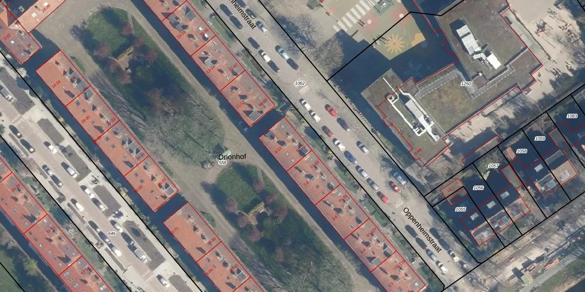 Het perceel waarop Oppenheimstraat 71 staat heeft een oppervlakte van 1,1 ha. Dit is een zeer groot perceel. De perceeloppervlakte wordt geregistreerd door het Kadaster. Gedetailleerde informatie over de maten van dit perceel kunt u vinden in het rapport Kadastrale kaart met maatvoering van Oppenheimstraat 71.