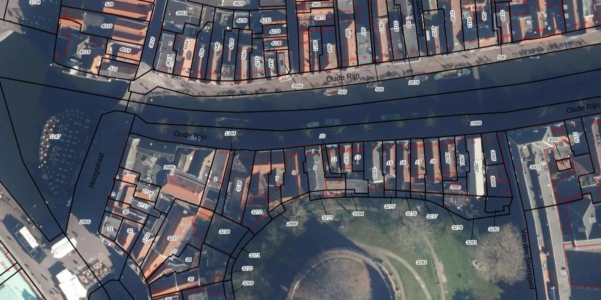 Oude Rijn 9 is gelegen op kadastraal perceel LDN01I8. Deze kadastrale aanduiding is uniek en wordt gebruikt door het Kadaster om eigendomsrechten en andere zakelijke rechten vast te leggen. Het perceel maakt onderdeel uit van de kadastrale gemeente Leiden.