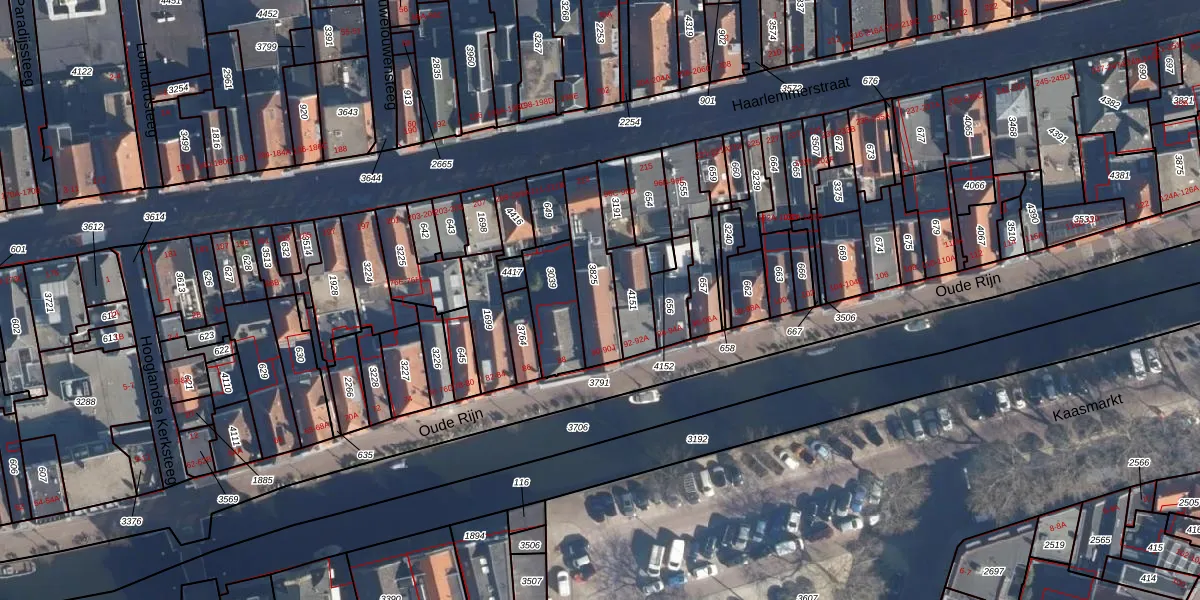 Het perceel waarop het adres ligt is LDN01-H-3825. De afkorting 'LDN01' staat voor kadastrale gemeente Leiden. De gemiddelde perceelgrootte in Leiden is 704,9 m². Dit perceel is kleiner: de perceeloppervlakte bedraagt 200 m². De grootste perceeloppervlakte in de kadastrale gemeente is 51,8 ha. De kleinste oppervlakte bedraagt 0 m². Op het perceel liggen in totaal 11 adressen. De huidige grenzen van het perceel zijn digitaal in de Basisregistratie Kadaster (BRK) geregistreerd op 06-02-1998.
