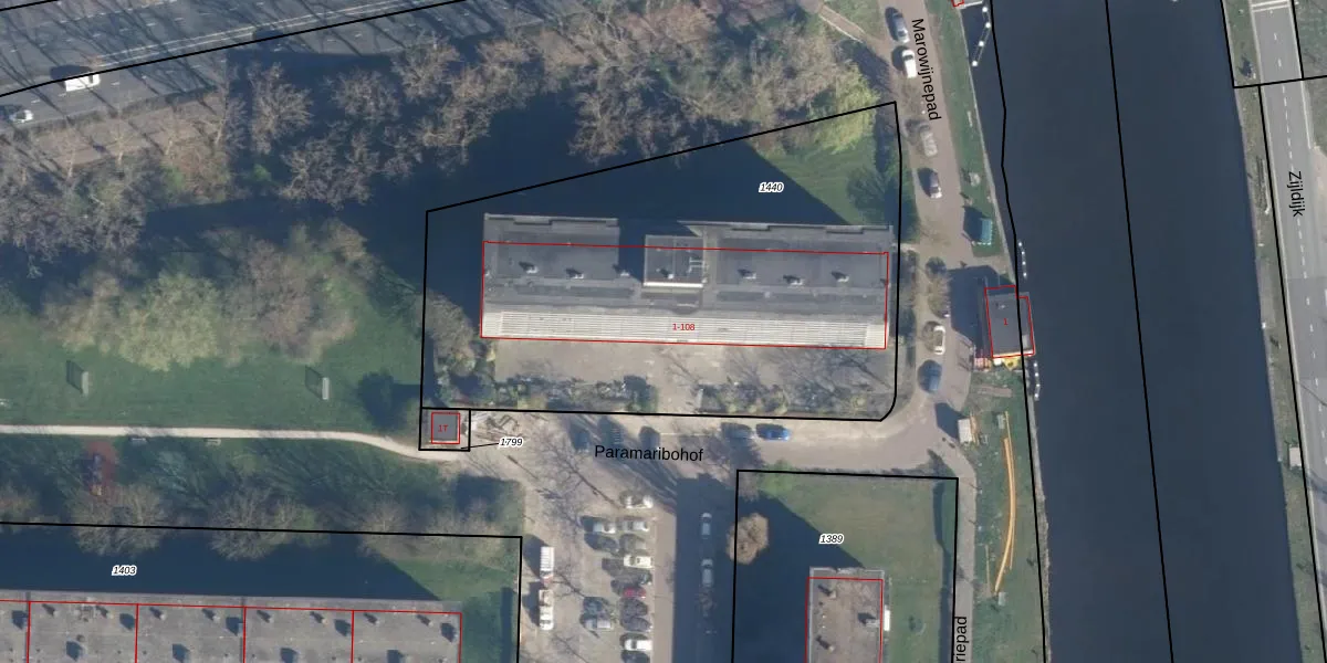 Het perceel waarop Paramaribohof 14 staat heeft een oppervlakte van 2765 m². Dit is een zeer groot perceel. De perceeloppervlakte wordt geregistreerd door het Kadaster. Gedetailleerde informatie over de maten van dit perceel kunt u vinden in het rapport Kadastrale kaart met maatvoering van Paramaribohof 14.