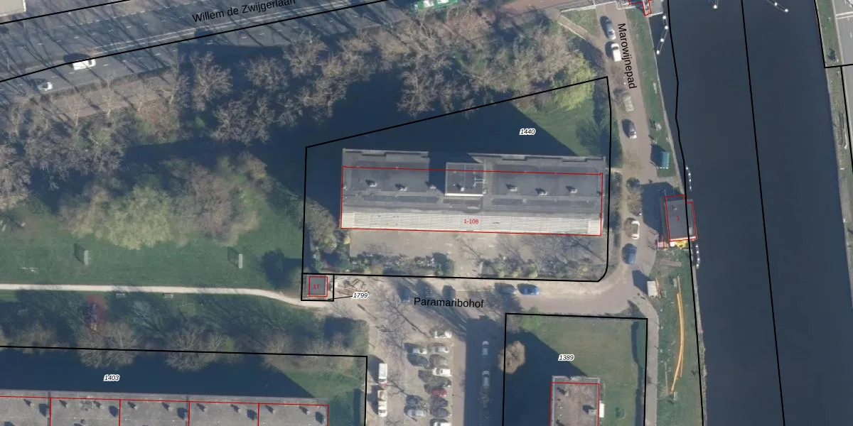 Het perceel waarop Paramaribohof 33 staat heeft een oppervlakte van 2765 m². Dit is een zeer groot perceel. De perceeloppervlakte wordt geregistreerd door het Kadaster. Gedetailleerde informatie over de maten van dit perceel kunt u vinden in het rapport Kadastrale kaart met maatvoering van Paramaribohof 33.