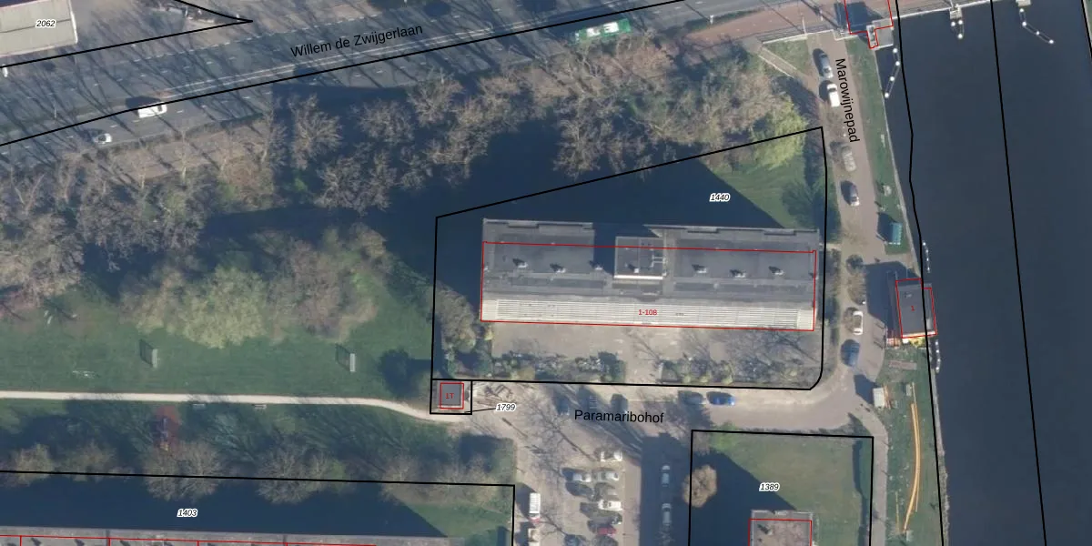 Het perceel waarop Paramaribohof 72 staat heeft een oppervlakte van 2765 m². Dit is een zeer groot perceel. De perceeloppervlakte wordt geregistreerd door het Kadaster. Gedetailleerde informatie over de maten van dit perceel kunt u vinden in het rapport Kadastrale kaart met maatvoering van Paramaribohof 72.