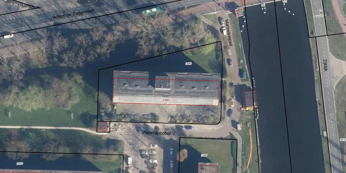 Het perceel waarop Paramaribohof 85 staat heeft een oppervlakte van 2765 m². Dit is een zeer groot perceel. De perceeloppervlakte wordt geregistreerd door het Kadaster. Gedetailleerde informatie over de maten van dit perceel kunt u vinden in het rapport Kadastrale kaart met maatvoering van Paramaribohof 85.