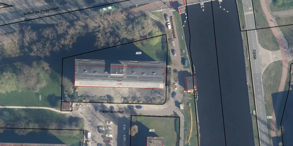 Het perceel waarop Paramaribohof 87 staat heeft een oppervlakte van 2765 m². Dit is een zeer groot perceel. De perceeloppervlakte wordt geregistreerd door het Kadaster. Gedetailleerde informatie over de maten van dit perceel kunt u vinden in het rapport Kadastrale kaart met maatvoering van Paramaribohof 87.