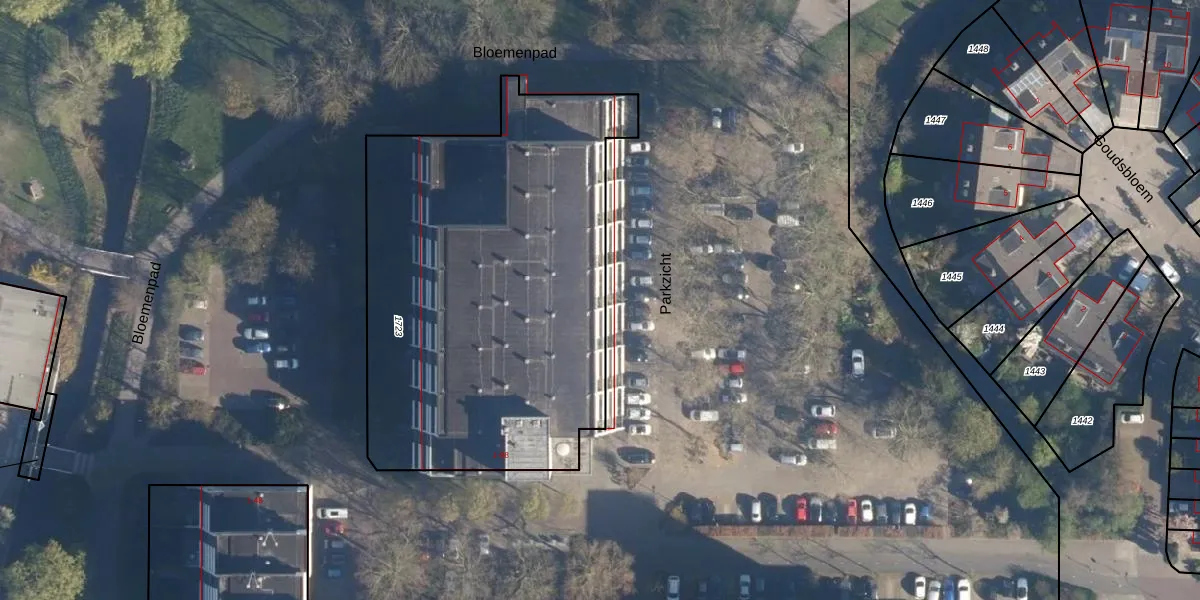 Het perceel waarop Parkzicht 5 staat heeft een oppervlakte van 2357 m². Dit is een zeer groot perceel. De perceeloppervlakte wordt geregistreerd door het Kadaster. Gedetailleerde informatie over de maten van dit perceel kunt u vinden in het rapport Kadastrale kaart met maatvoering van Parkzicht 5.