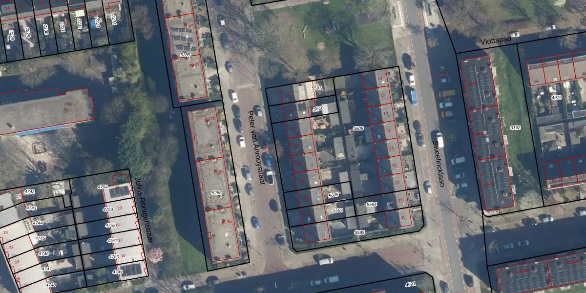 Peter van Anrooystraat 22 is gelegen op kadastraal perceel LDN01O5608. Deze kadastrale aanduiding is uniek en wordt gebruikt door het Kadaster om eigendomsrechten en andere zakelijke rechten vast te leggen. Het perceel maakt onderdeel uit van de kadastrale gemeente Leiden.